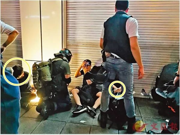 ▲两名黑衣男子被捕(见圆圈),另一名头部受伤黑衣男子获警员照料