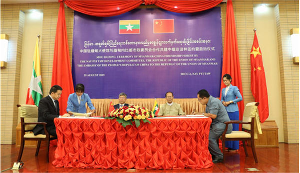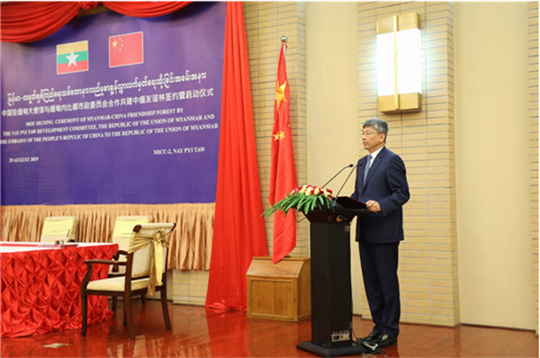8月29日,中缅友谊林签约暨启动仪式在缅甸内比都举行。驻缅甸大使陈海、内比都市政委员会主席苗昂、自然资源与环境保护部部长翁温、国际合作部部长觉丁、内比都市政委员会委员、中国使馆及缅有关部门代表出席。