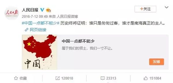 媒体上,中国摆出了最直接的口号,对所谓的仲裁结果,“不接受、不参与、不承认、不执行!”“中国,一点都不能少!”