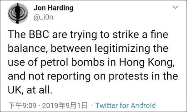 还有英国网民在社交媒体上讽刺BBC说,“BBC正试图在香港街头可以合法化使用汽油弹和完全不报道英国街头的抗议活动之间,达成微妙的平衡。”