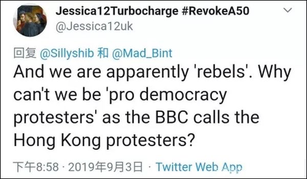 在被称之为“反叛者”后,有英国网民坦诚的接受了这一称呼。但是他同时质问道:“为什么不说我们是像香港的那群抗议者一样,是在支持民主的呢?”