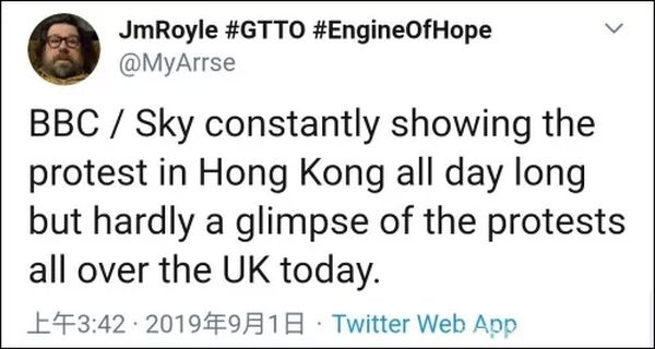 有网民指责英国媒体BBC和天空电视台说,他们一整天都在播放香港示威活动,但是对于英国各地出现的抗议活动,根本就不报道。