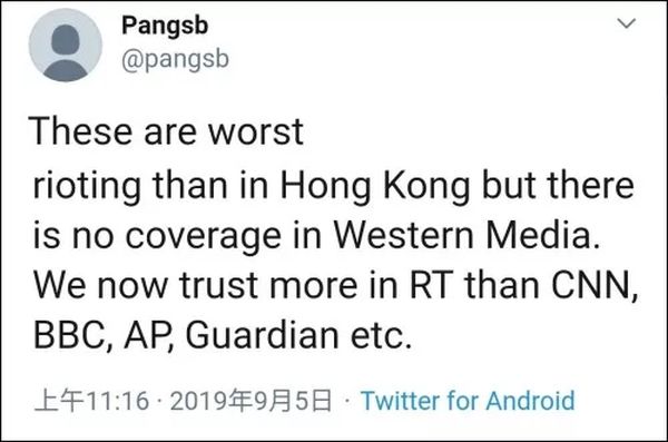 “这里有比香港更为严重的骚乱,但是西方媒体完全报道。相较于CNN、BBC、AP和卫报,我们更相信RT了。”