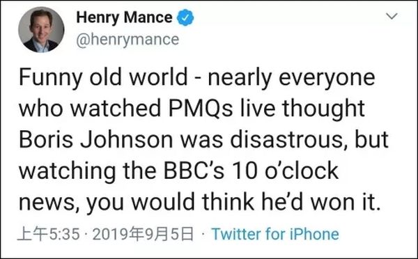 “这老地方真有趣:几乎每一个看了首相问答直播(PMQs LIVE)的都认为鲍里斯·约翰逊遭遇了灭顶之灾。但是看了BBC的《10点新闻》后,你会以为他赢了。”