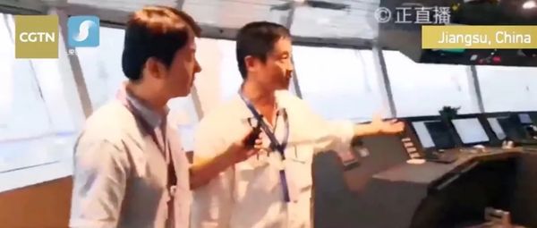 ▲记者在邮轮驾驶室(CGTN报道截图)