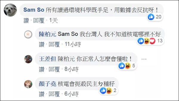 问:“我是台湾人,我不知道核电哪里不好”,答:“核电会扼杀民主的种子”。