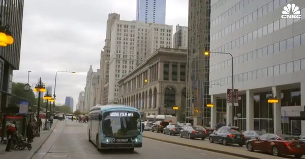 ▲电动公交行驶在美国街道上(CNBC报道截图)