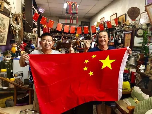 金门居民王明宗(右)和朋友一起展示五星红旗。来源:香港大公网