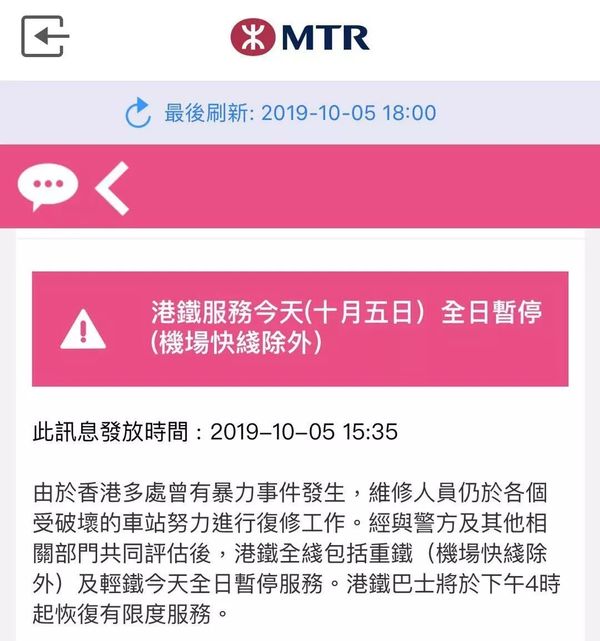 不过这种事情今天(5日)不存在了,港铁全天全线停止运营,商场、超市关门,多场活动被迫取消,连考试也延期了……