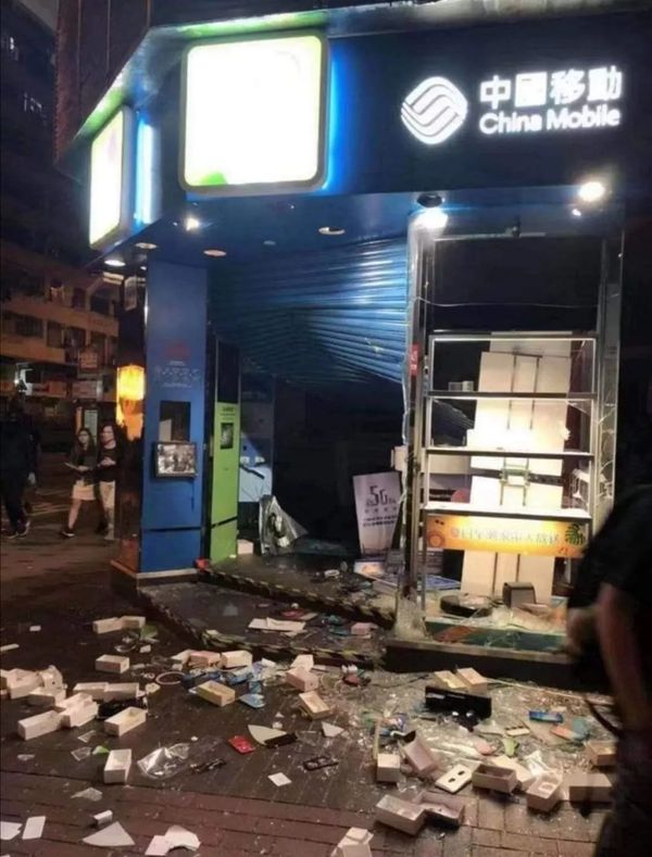 中移动门店被示威者破坏,货品给人取走。图:读者提供
