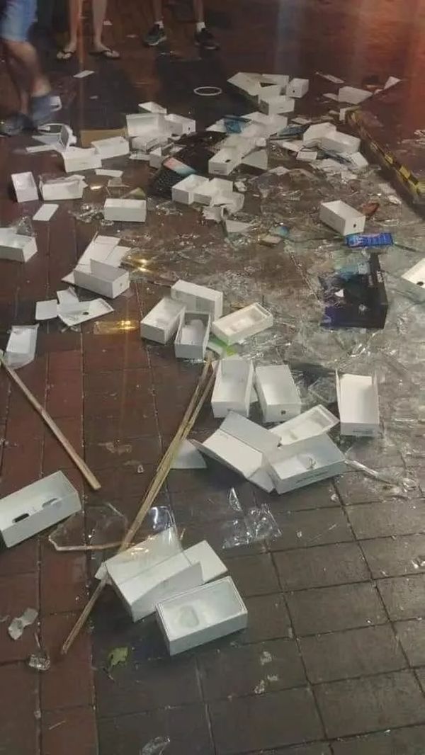 警察公共关系科高级警司余铠均凌晨会见传媒,她说,有商店的橱窗玻璃被打烂,货物包装盒散落一地,盒内的电子产品包括电话不见了。