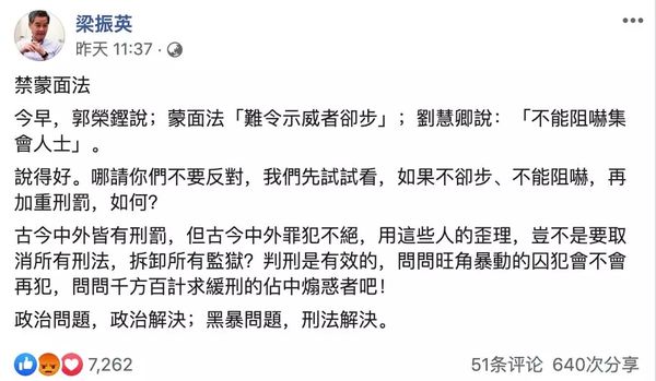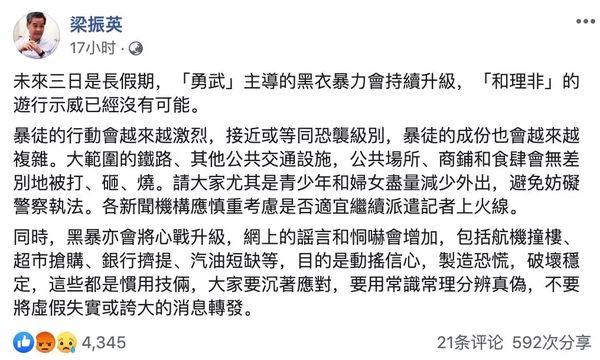 对于《禁蒙面法》颁布后示威者疯狂反扑,前特首梁振英接连在个人主页发文,提醒大家未来三日小心。