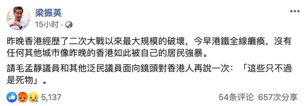 今天下午2点半左右,行政长官林郑月娥向全港市民发表讲话,指暴徒极端行为,令香港昨晚经历非常黑暗的一夜,同时令社会陷于半瘫痪。她强调政府将以最大决心压止暴力,呼吁广大市民支持特区政府依法制暴,一同谴责暴力,并以坚定意志与暴徒割席。
