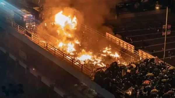 黑衣蒙面暴徒17日开始聚集在校内,与警方对峙。他们点燃了红磡大桥,又疯狂地用燃烧瓶袭击了警方的武装装甲车。