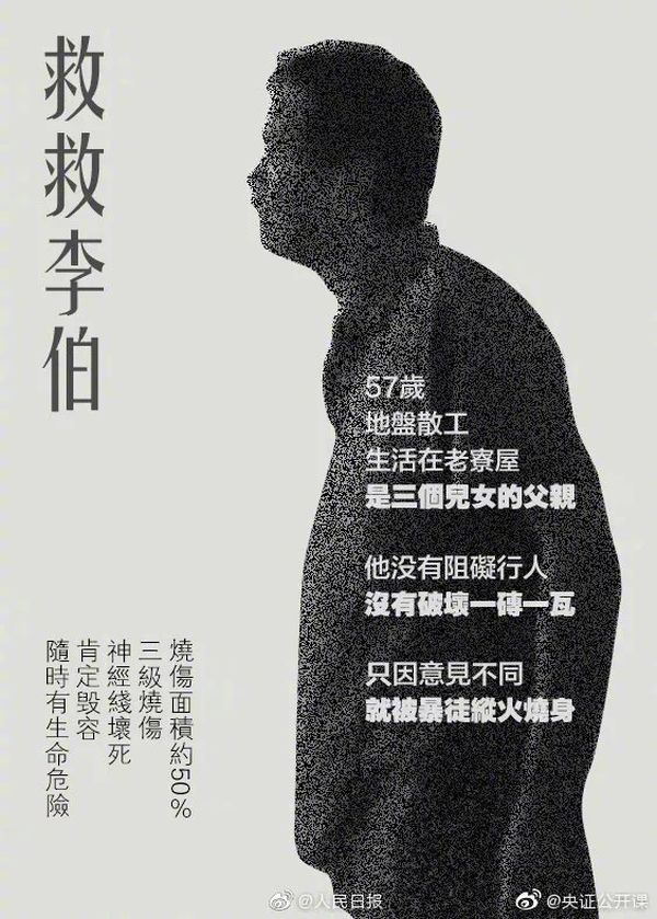 仅仅因为表达了爱国,就被火烧,至今生命垂危的李伯。