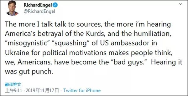 恩格尔在17日的推文中这样写道:“我和我的信源们聊的越多,听到的抱怨也越多,比如说美国政府最近背叛了叙利亚库尔德人,美国前驻乌克兰大使被解职的原因是白宫‘打压和歧视女性’。这些带有政治动机的行动让人们认为,我们美国人已经变成了‘坏人’。听到这些,我感到心脏遭受重击。”