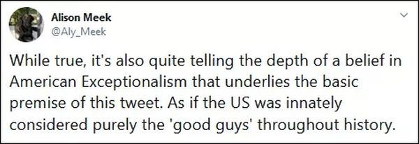 “这充分说明了美国例外论的影响程度有多深,美国例外论是这条推特的基本前提,好像美国在历史上天生就是个纯粹的‘好人’一样。”