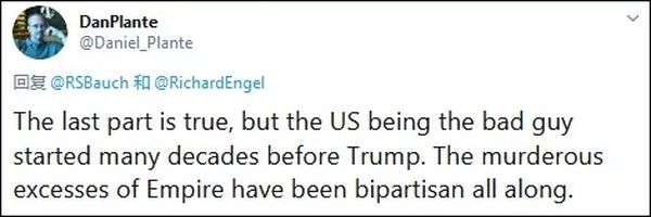 “最后那部分(美国是坏人)是对的,不过在特朗普之前几十年美国就开始是坏人了。两党在帝国的残暴行径上一直是一致的。”
