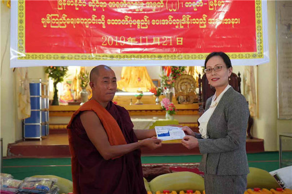 11月21日,中国驻缅甸使馆向中缅第23号友谊学校——掸邦昂米达亚佛寺学校捐赠物资仪式在掸邦腊戌举行,中国驻缅甸使馆公参李小艳、昂米达亚佛寺学校校长班德大达德纳方丈出席仪式并致辞。