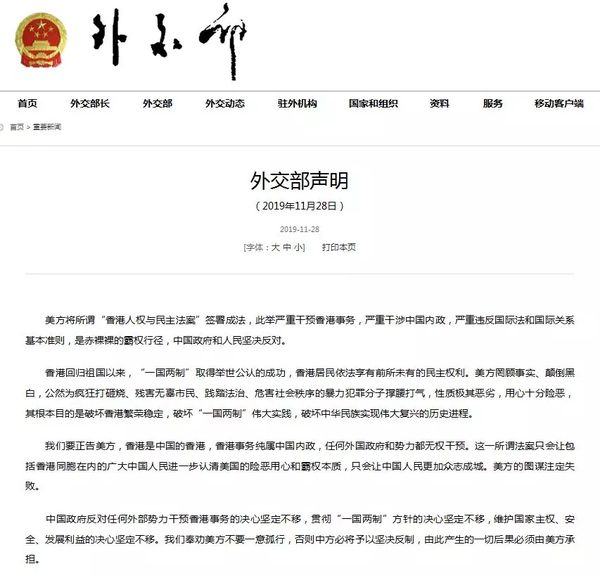 美方将所谓“香港人权与民主法案”签署成法,此举严重干预香港事务,严重干涉中国内政,严重违反国际法和国际关系基本准则,是赤裸裸的霸权行径,中国政府和人民坚决反对。