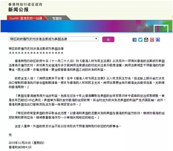 香港特别行政区政府今日(十一月二十八日)对《香港人权与民主法案》以及另外一项有关香港的法案成为美国法律表示强烈反对,并对美方无视港方多次就两项法案提出的切实关注表示极度遗憾。两项法案明显干预香港的内部事务,既无必要,亦毫无理据,更会损害香港和美国之间的关系和利益。