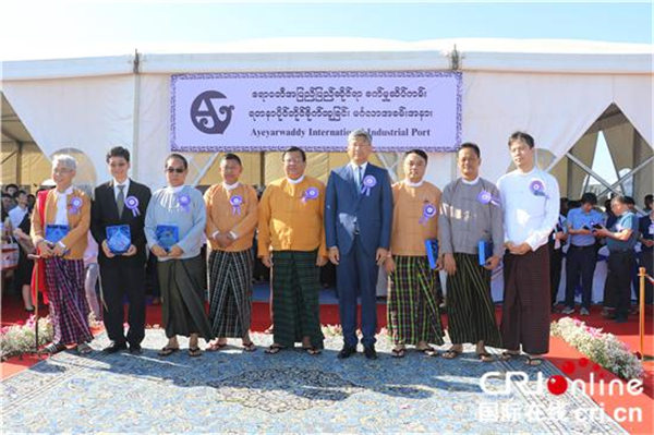 中国驻缅甸大使陈海(右四)和缅甸伊洛瓦底省首席部长吴拉貌昂(右五)出席勃生工业园码头动工仪式
