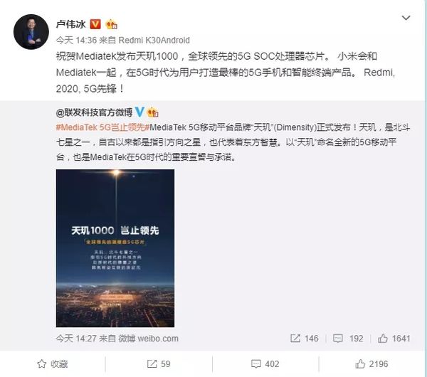 就在联发科发布之后,小米集团副总裁、Redmi品牌总经理卢伟冰也发布了相应的微博。