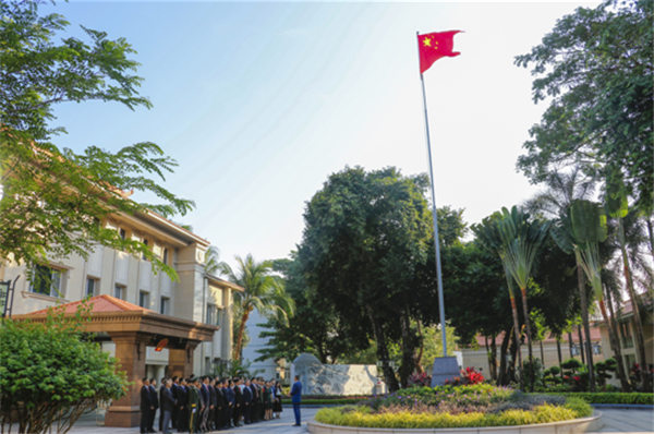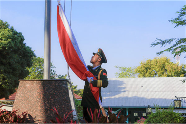 1月1日,驻缅甸使馆举行升国旗仪式。全体馆员庄严肃立,齐唱国歌。鲜艳的五星红旗冉冉升起、迎风飘扬。