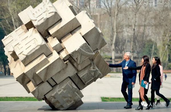 2017年3月,拉脱维亚里加理工大学副校长伊格斯·提潘斯(左一)参观中国西安交通大学四大发明广场上的活字印刷术雕塑。2015年5月,“新丝绸之路大学联盟”正式成立,逐步打造“丝绸之路学术带”。新华社 供图