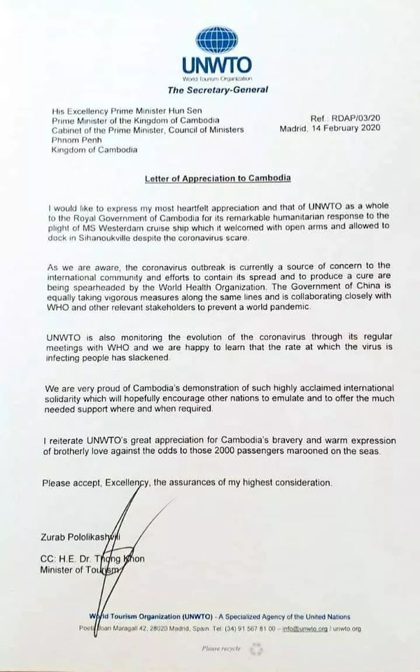 联合国世界旅游组织致柬埔寨的感谢信。