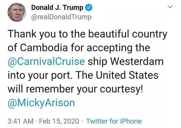 2月15日,美国总统特朗普在自己的官方推特(twitter)发布推文,感谢柬埔寨总理洪森和柬埔寨人民,允许让被日本、菲律宾、泰国和中国台湾拒绝停泊的 “威士特丹”号邮轮进入西港港口停泊。