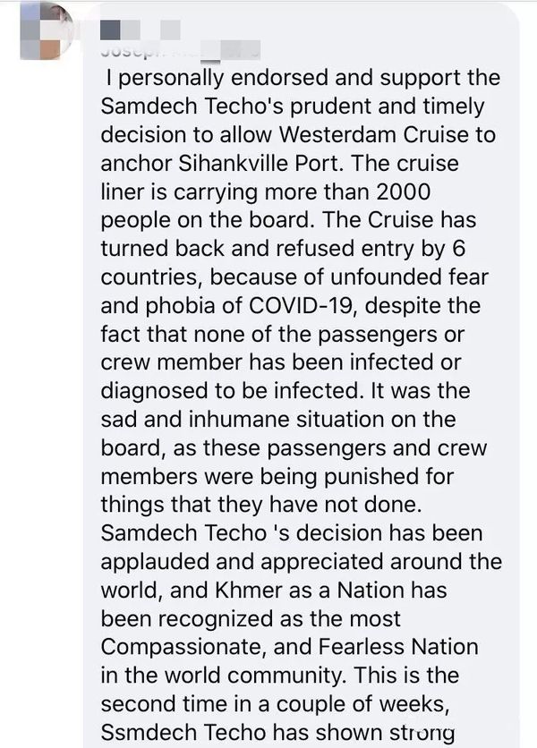 荷美游轮公司表示,游轮上的所有游客都对柬埔寨政府当局的帮助表示衷心的感谢,并承诺将会铭记柬埔寨政府的人道、无歧视的善举。