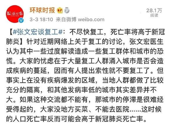 他说,媒体不恰当的宣传,迎合了民众过分恐慌的心理,为防止复工造成的疫情蔓延,不少人索性不再复工。