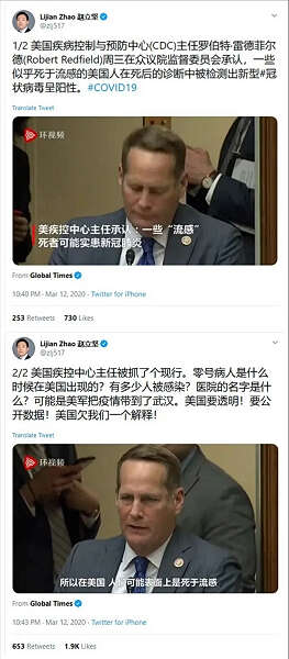 中国外交部发言人赵立坚连发推特怒怼美方,并且根据美国CDC承认“部分死于流感的人可能实际上死于新冠肺炎”,提出质疑:中国的病毒有可能是从美国传入的。他认为美方欠中国一个解释。这些推特引起强烈反响。