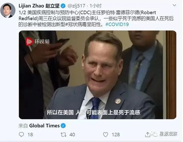 这段视频为赵立坚提供了证据,于是发问:“美国疾控中心主任被抓了个现行。零号病人是什么时候在美国出现的?有多少人被感染?医院的名字是什么?可能是美军把疫情带到了武汉。美国要透明!要公开数据!美国欠我们一个解释!”