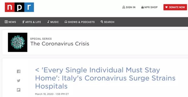 NPR主持人伯格里:截至周四(3月19日)晚,意大利的死亡人数已经超过3400人。意大利为应对疫情,已经进入战时紧急状态。