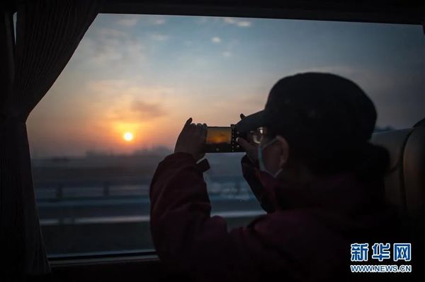 ▲3月17日,陕西国家紧急医学救援队队员在回程的车上拍摄武汉的日出。