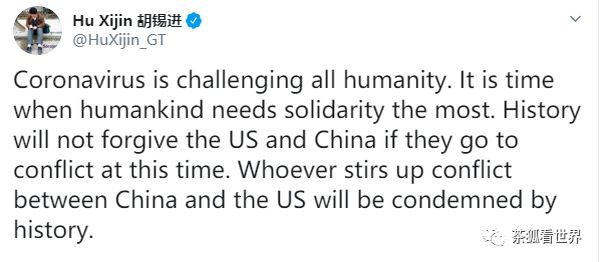 胡主编向来走温和路线,他说:新冠病毒正在挑战全人类,在这关键时刻,人类应该团结一致。如果在这个时候互相斗争,历史将不会原谅中美两国,无论是谁破坏中美关系,都将受到历史的谴责!