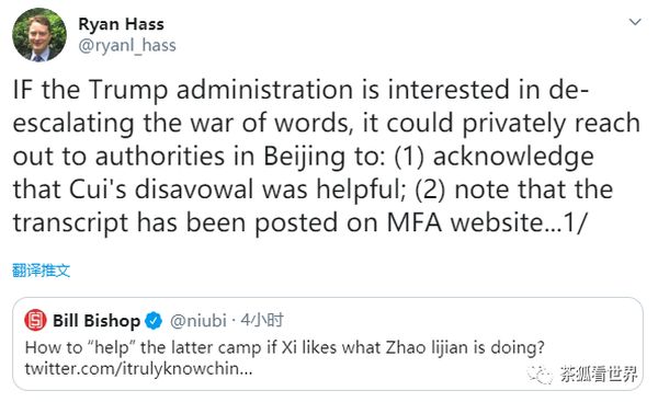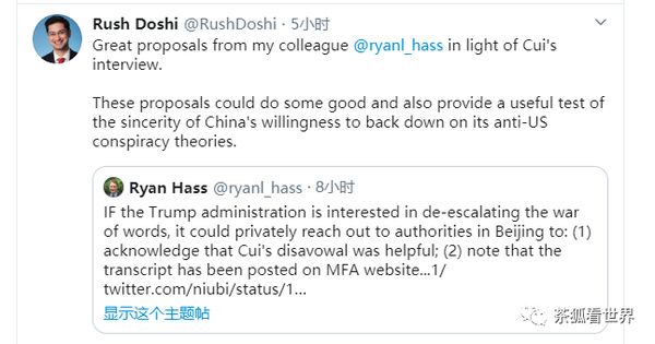还有一个新崛起的中国通Rush Doshi,他应该是印度背景,能说能讲流利的中文和印地语,他也马上转推,并评论道:这些都是很好的建议,可以用来检验中国是否有诚意减少对美国的阴谋论攻击。