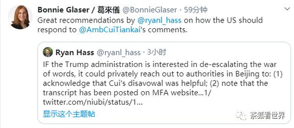 首先转发的是葛来仪,国战略暨国际研究中心(CSIS)亚洲事务资深顾问,这个女人和台湾的关系很深,她转发并评论道:对于美国政府如何回应崔天凯,这些是很好的建议。