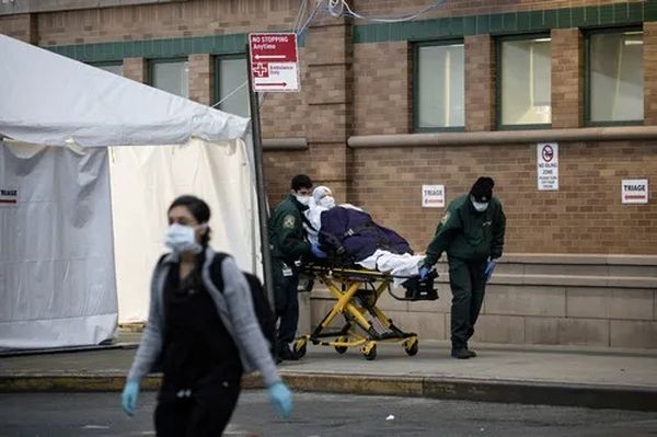 ▲资料图片:3月28日,医护人员将病人送往美国纽约布鲁克林一家医院的急诊室。新华社发