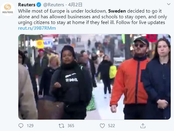 路透社4月2日报道,当欧洲其他国家采取封锁措施时,瑞典决定“我行我素”,商场、学校依然开放,只建议民众如果感到不舒服就待在家。