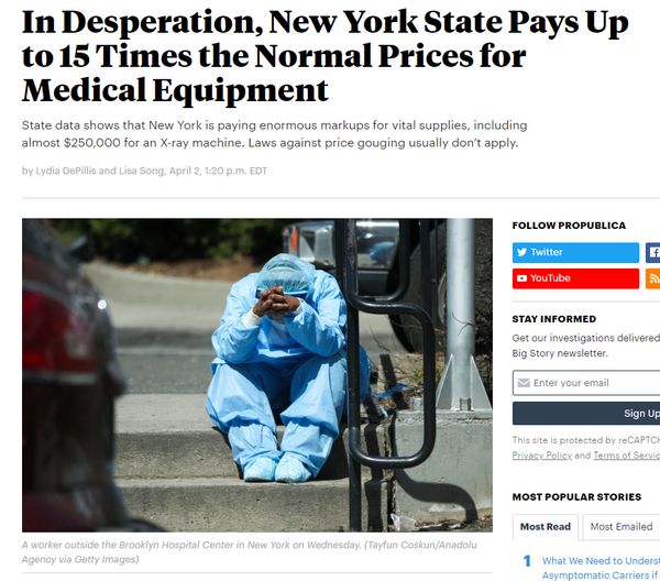 美国政府提供的这些采购价目表显示,关键医疗设备的短缺正在推高价格。由于被迫在熟悉的供应商和合同之外寻找资源,美国各州和各城市在一个由供需决定的现货市场上支付过高的价格。虽然纽约州总检察长已经批评这一现象,并下令商家停止提高洗手液、消毒剂和喷雾剂等产品的价格,但限制坐地起价的州级法律并不适用于政府采购。