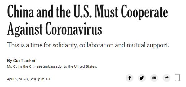 纽约是我最喜爱的美国城市,我曾在这里工作和生活,担任驻美大使以来也经常往访。而今在新冠肺炎疫情肆虐下,这座欢腾喧嚣的不夜城却被按下了暂停键,我很痛心。此次疫情席卷全球,带来巨大挑战,其影响不分国界和种族。