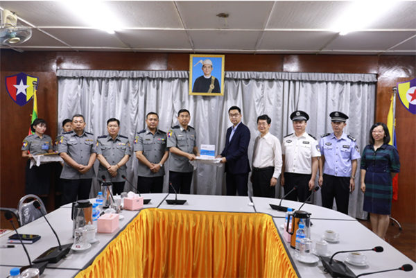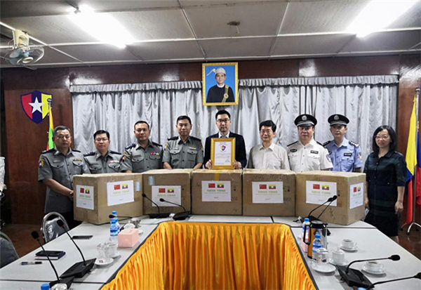 缅投资与管理局局长丹欣伦、仰光警察厅厅长苗敏泰代表上述部门接收捐赠物资并向有关企业颁发感谢状。中国驻缅甸使馆经商参赞谭书富、警务参赞刘咏赞等参加。
