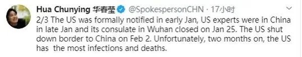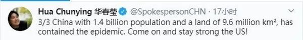 “有着14亿人口和960万平方公里土地的中国已经控制了疫情。美国加油,保持强大!”中国外交部发言人华春莹12日又发推了。这次,她连发多条推文,介绍中国的抗“疫”举措,并为目前累计确诊新冠肺炎病例数居全球第一的美国“加油”。