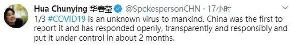 “新冠病毒对人类来说是一种未知病毒。中国最先报告,公开、透明且负责任地做出响应,并在大约两个月内控制了局势。”华春莹首先写道。↓