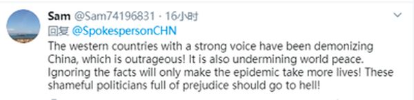 “西方国家的声音很强烈,一直妖魔化中国,这很离谱!这是在破坏世界和平。无视事实只会让疫情夺走更多的生命!这些满腹偏见的可耻政客应该下地狱!”