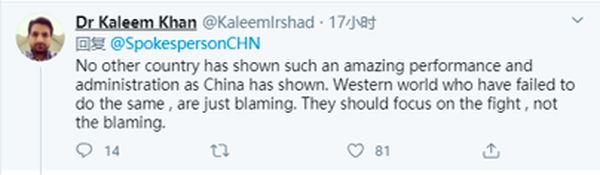 “没有一个国家展现出了像中国所表现出的如此惊人的表现和管理(能力)。西方世界没能做到这一点,他们只是在指责。他们应该专注于抗击(病毒),而不是指责(别人)。”