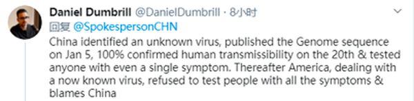 “中国确认了一种未知病毒,并于1月5日发布了(病毒)基因组序列,20日100%确认(病毒)可以人传人,并对任何仅出现单一症状的人进行检测。此后的美国,应对的是一种已知的病毒,拒绝对出现了所有症状的人进行检测,同时指责中国。”